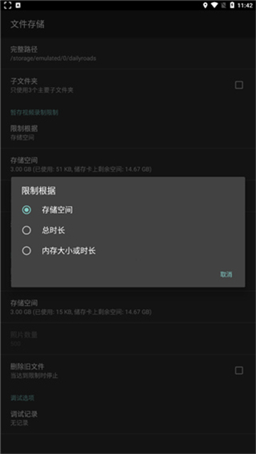 答:应用自带循环录像功能,你设定好存储空间上限,它会自动覆盖最早的视频文件。