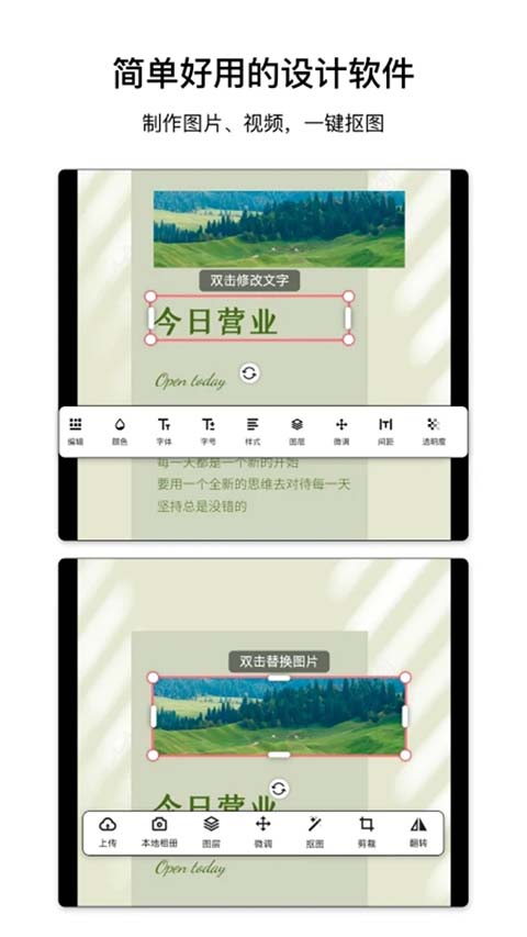 3. 点击图片区域,可以从手机相册上传自己的照片,替换掉模板里原来的图片。